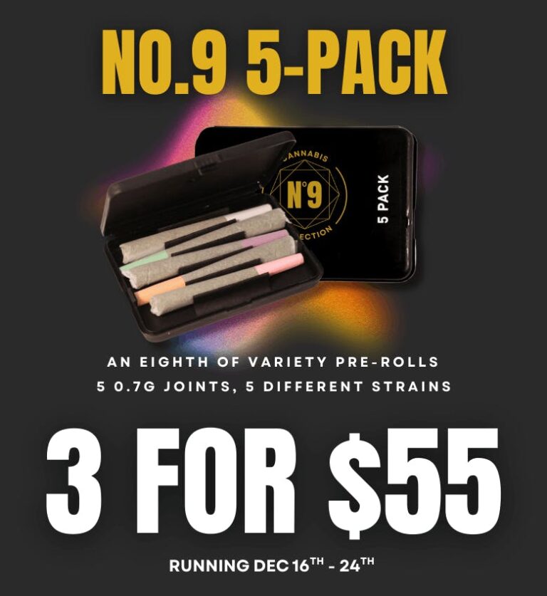 3 For $55 No.9 Variety Pre-Roll 5-Pack While Supplies Last, Enjoy The Countdown To Christmas By Getting 3 No.9 0.7g Variety Pre-Roll 5pk For $55! Discount Will Be Applied In Store. Shop Now ⭢