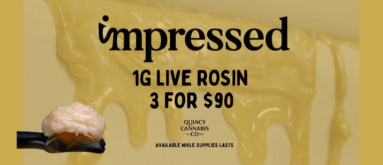 Impressed Live Rosin 3g for $90 Mix and Match Impressed 1g live rosin 3g for $90! Discount will be applied in store Shop Now ⭢